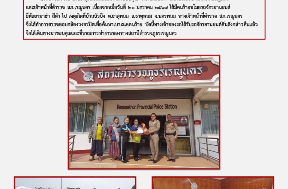 คันดังกล่าวคืนแล้ว จึงได้เดินทางมาขอบคุณและชื่นชมการทำงานของทางสถานีตำรวจภูธรเรณูนคร