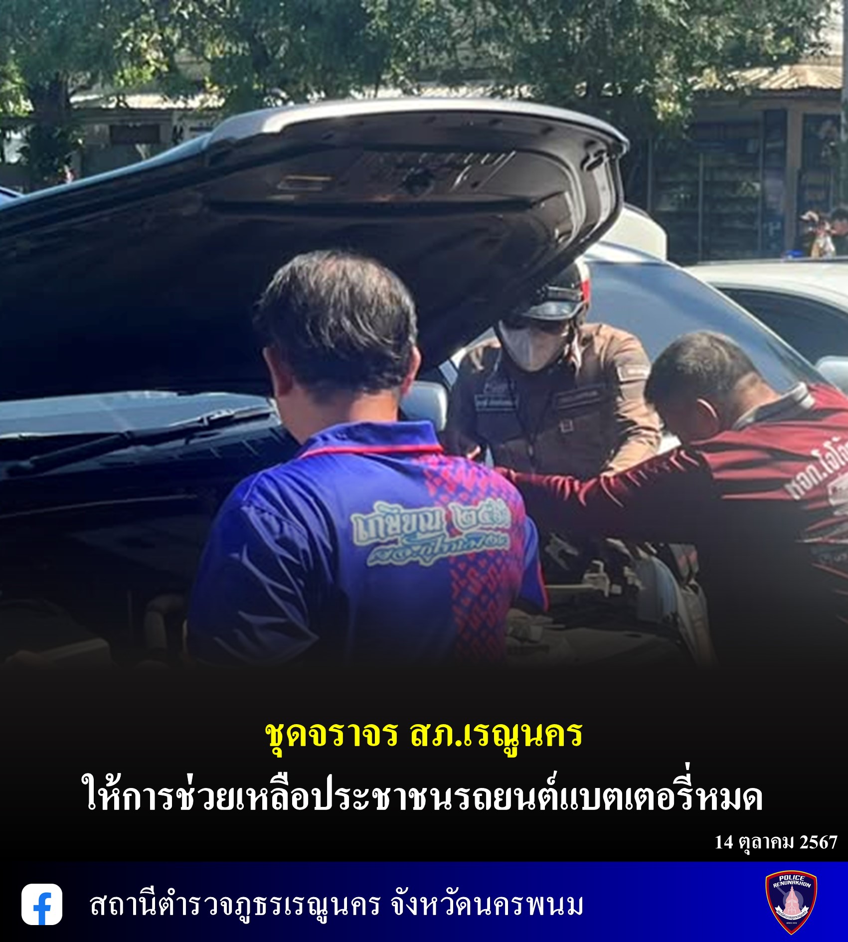 วันนี้ (14 ต.ค. 67) เวลา 10.23น. ชุดจราจรสภ.เรณูนคร ให้การช่วยเหลือประชาชนรถยนต์แบตเตอรี่หมด ได้ให้ก