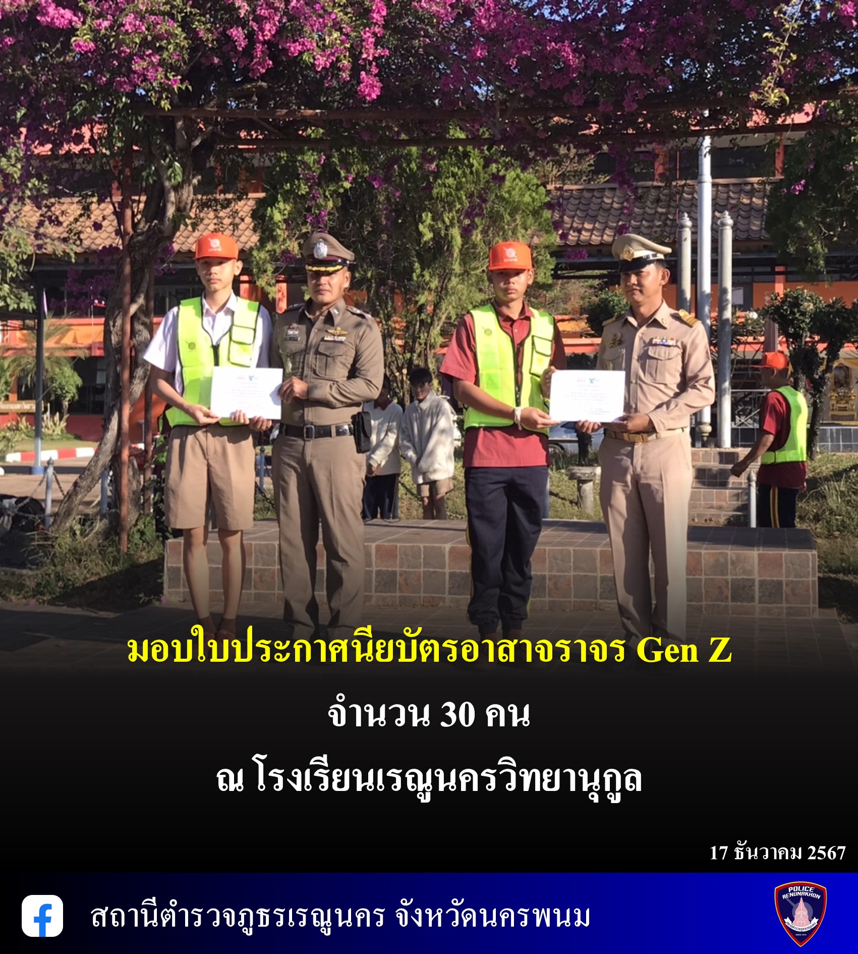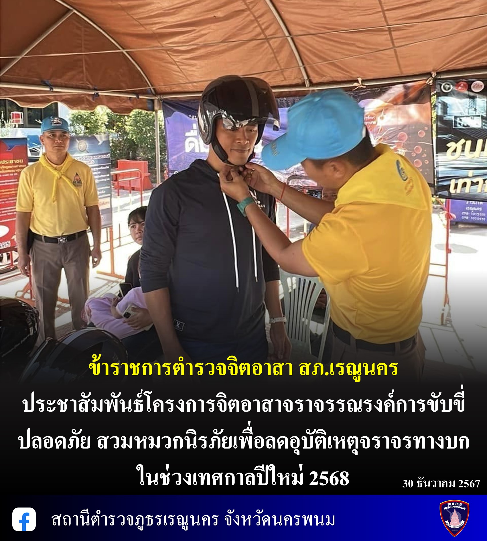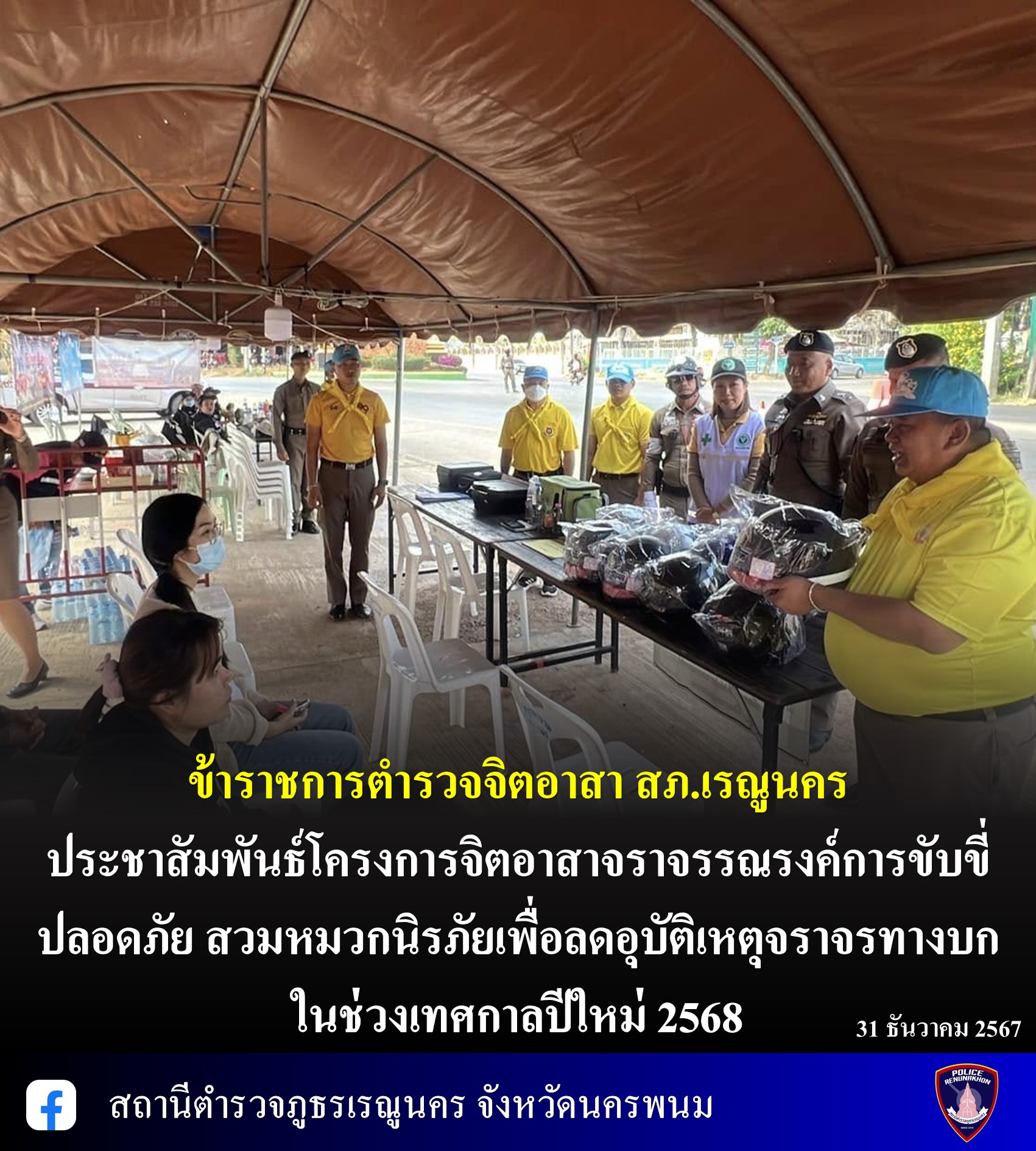 ข้าราชการตำรวจจิตอาสา สภ.เรณูนคร ประชาสัมพันธ์โครงการจิตอาสาจราจรรณรงค์การขับขี่ปลอดภัย สวมหมวกนิรภัยเพื่อลดอุบัติเหตุจราจรทางบก ในช่วงเทศกาลปีใหม่ 2568
