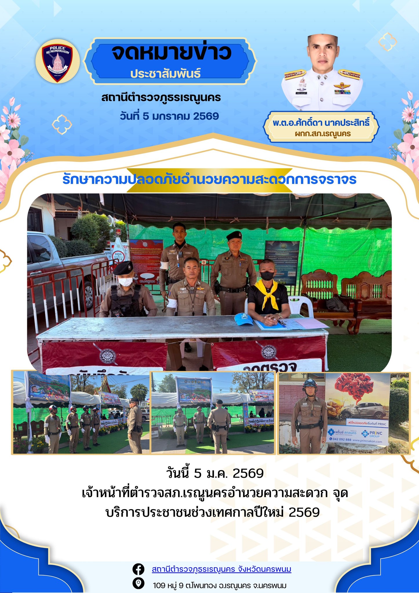 ชุดจราจร อำนวยความสะดวกการจราจร งานนมัสการพระธาตุเรณู เพื่อป้องกันการเกิดอุบัติเหตุและลดปัญหาจราจรติดขัด